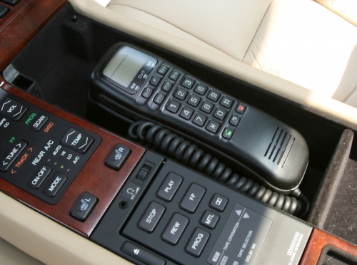 リヤアームレスト内に収まった自動車電話、雰囲気アップに大きく貢献するアイテムです♪