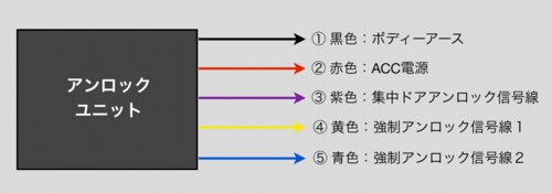 自動アンロックユニットに必要な配線は5本、その取り出しおよび接続について記載します。